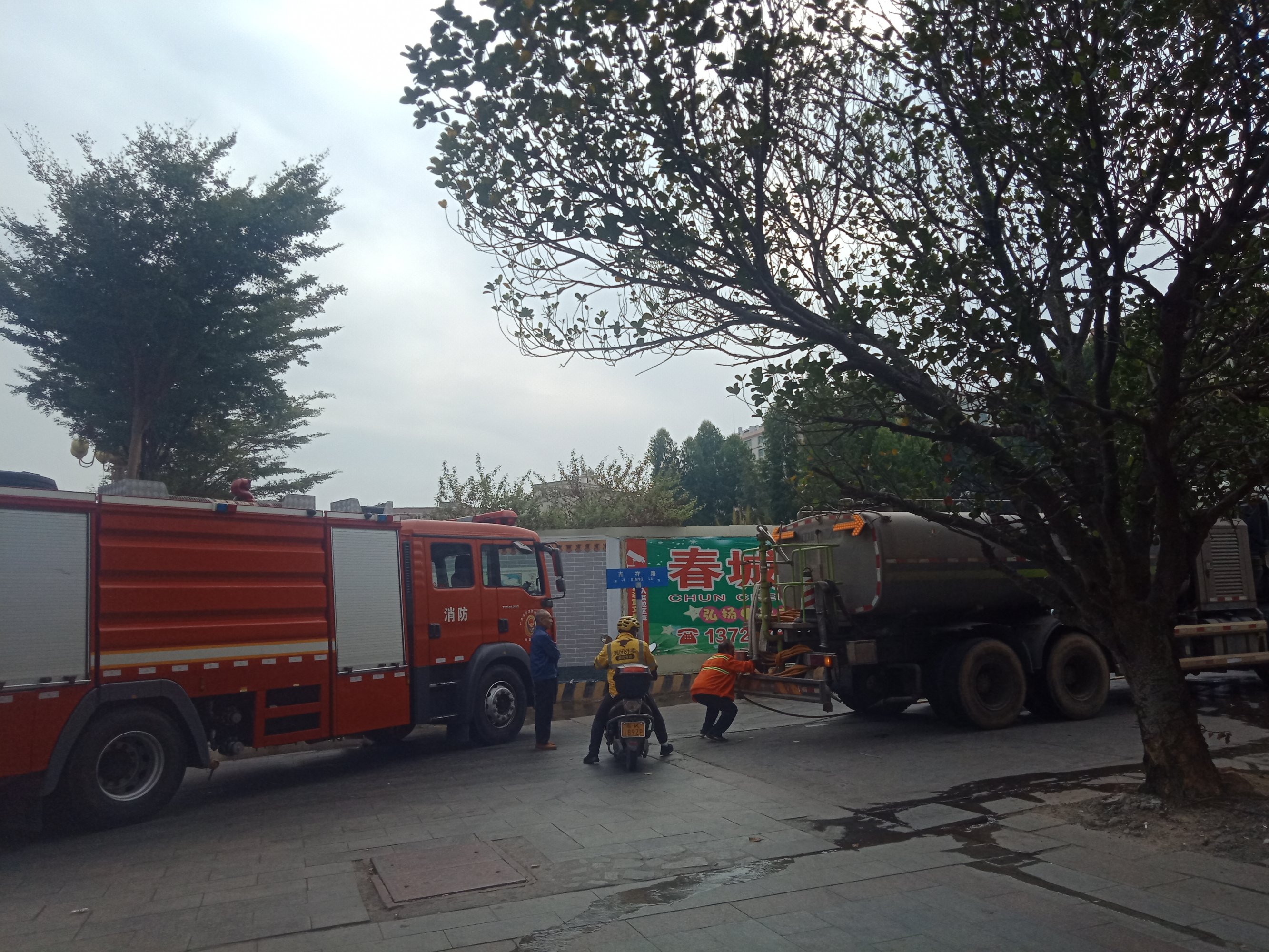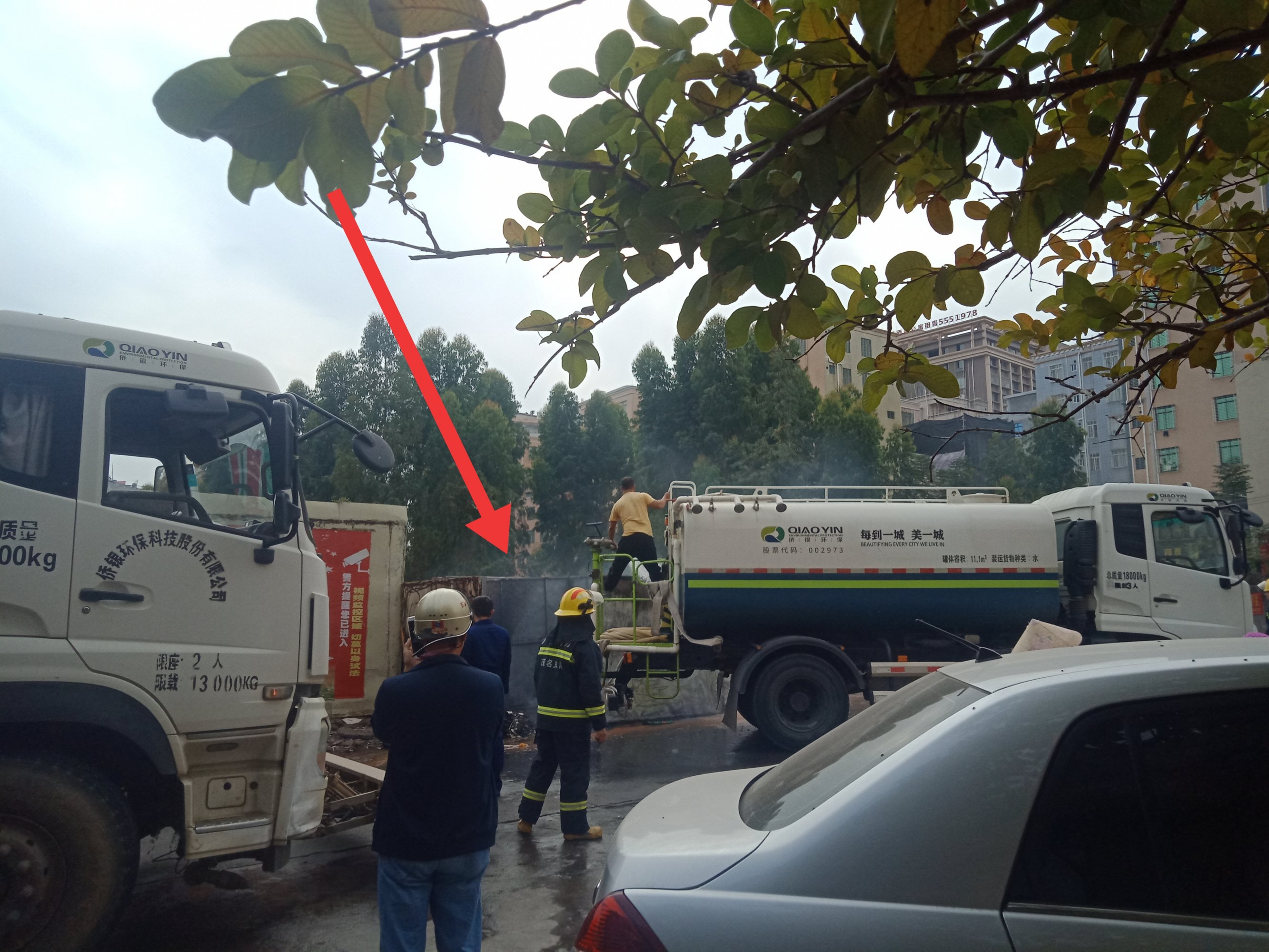 在远处见有浓烟升上天空,在对面见有熊熊大火,像见有人在用灭火器喷洒效果不佳?可能有人报警,刚巧又有在附近的洒水车与后赶过来的消防车还有辖区派出所等过来,风高物燥,小心火烛
