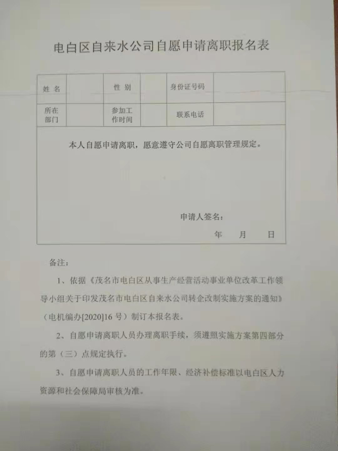 话归正传,自来水公司出了个改制方案(请大家看附件)。还有国家政策允许的双向选择,有意向选择离职的。电白自来水公司与电白水务投资集团的领导竟然在这上面意欲捆绑不公平的条约。有意向申请离职的表格里如签卖身契般的霸王条款!写申请就是同意了他们所有的规则,不容反驳,而且昨天公布今天就截止。过期不写当放弃申请离职的权利!电白区自来水公司的领导到底是法盲还是流氓??大家评评理!更可笑的是那赔偿方案,没有任何法律有效的依据或有关国家或省政府有关政策文件作为赔偿依据!!自来水公司领导说是水投集团做的!无论是哪个部门做的,请你们拿出你们合法的依据出来!我们不会屈服强权,只会信服正义!!一定会为不公平抗争到底!那些电白区自来水公司违法乱纪的领导你们一个也跑不掉!!!
