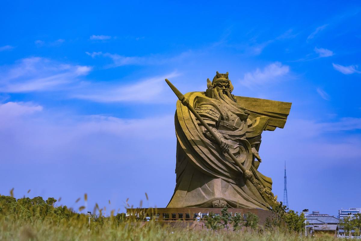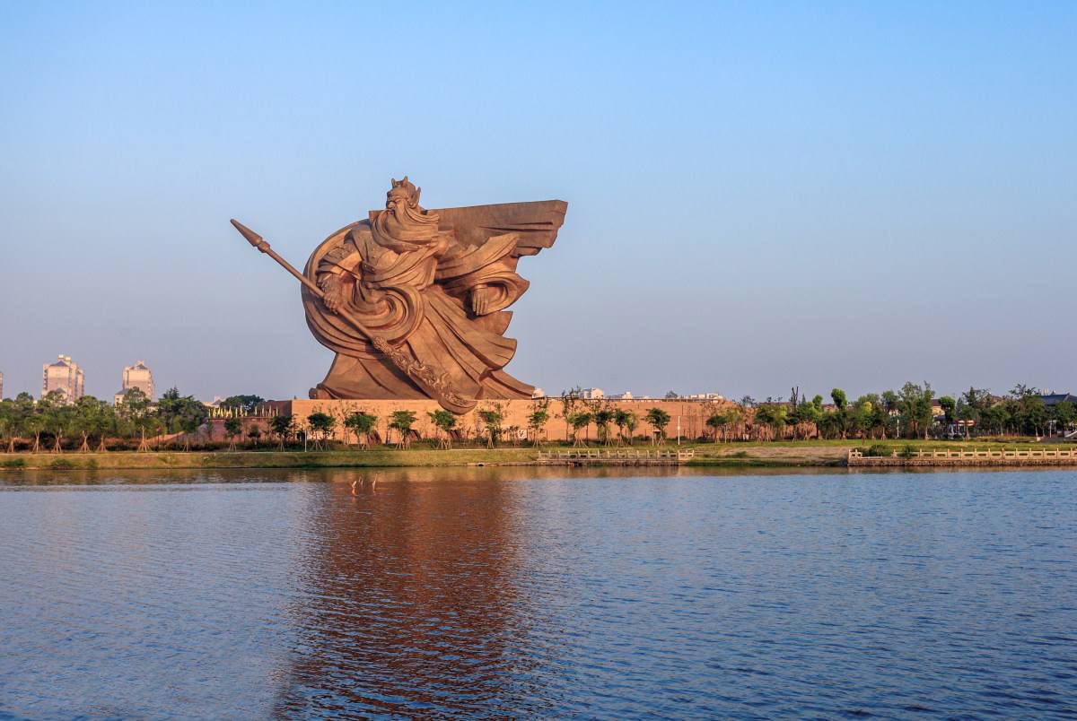 “关公雕塑”,位于荆州市关公义园里,雕塑高58米,重达1200吨。雕塑的关公双目微醺,不怒而威,侧身迎风而立,右手拖一把70米长大刀,整个身躯如山峦般屹立。