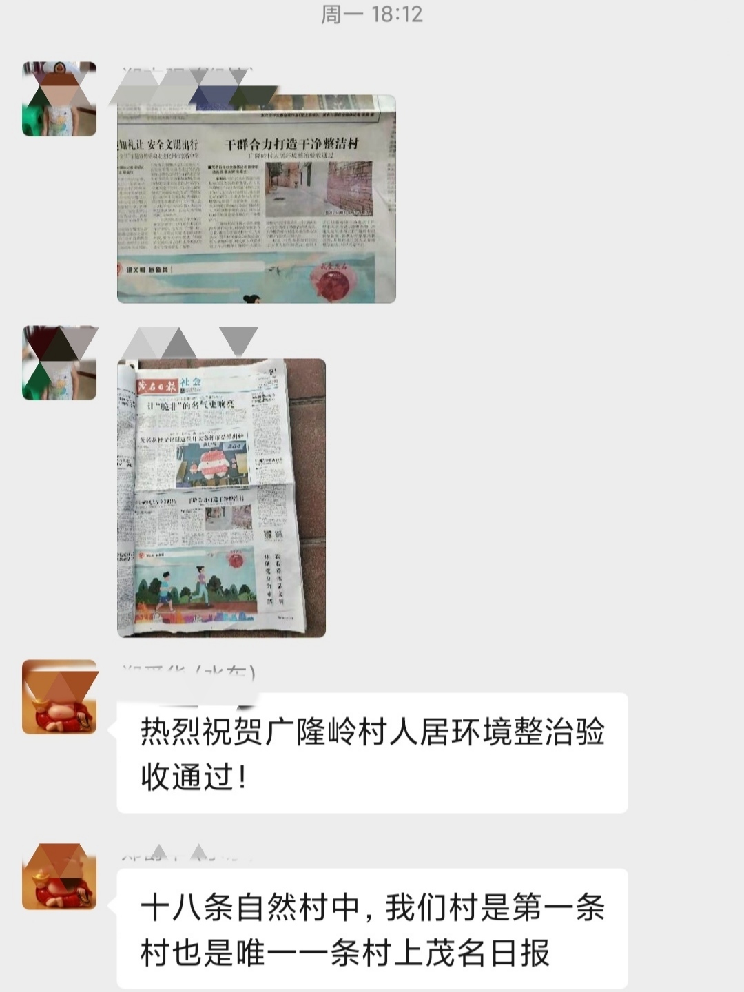 全区农村人居环境整治巩固提升村村过关“百日攻坚战”,广隆岭村积极参与配合政府有关单位工作,加力加劲、真抓实干、本村已验收通过了区农村人居环境提升村村过关目标任务,并登上了茂名日报新闻报纸。(图片资料来自村群和村民发布)