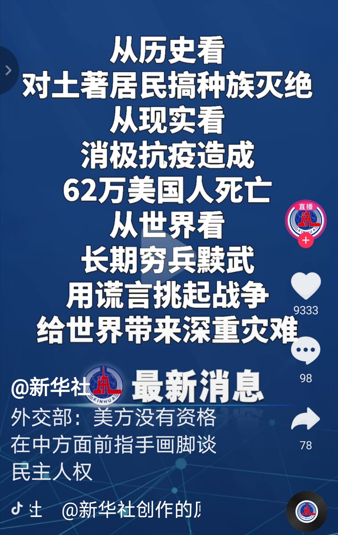 绿城风景 说: 在英美很多60岁以上新冠老人,是给人权,民主,自由的手拔掉呼吸机的管死掉的。 点击展开... 总结得非常中肯,到位。英美那些国家高举所谓虚假的人权,民主,自由,只不过是他们最后一块遮羞布。事实和理论证明,只有社会主义国家才可以让人民过上幸福生活。