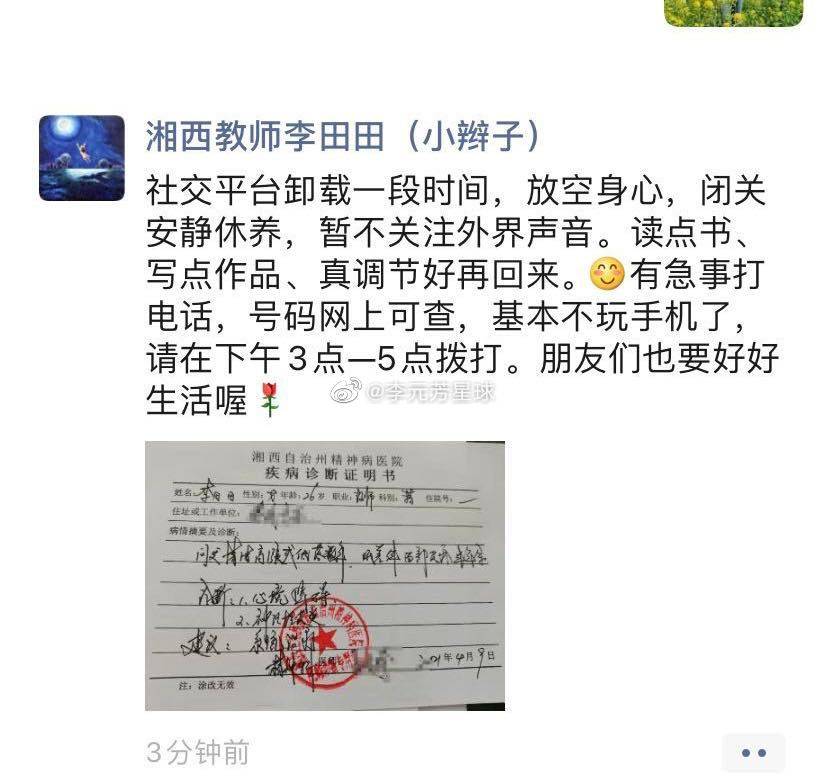 所以,对于李田田老师的精神病到底是怎么来的,到底是什么时候发作的,到底严重到什么程度,到底需要做什么样的治疗,大约需要治疗多久,治疗预期效果如何,教育、卫生、妇联等部门做了什么安抚和善后......永顺有关方面应该尽快给公众一个权威的、公开的说法。
