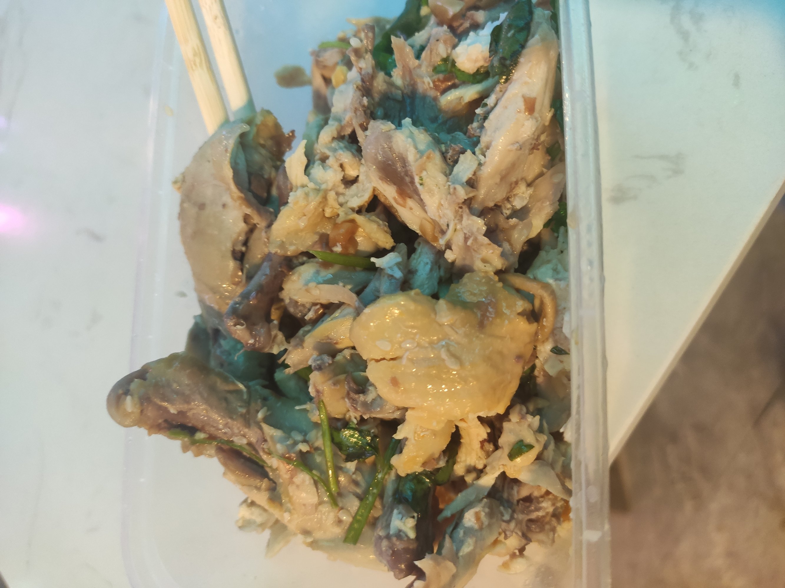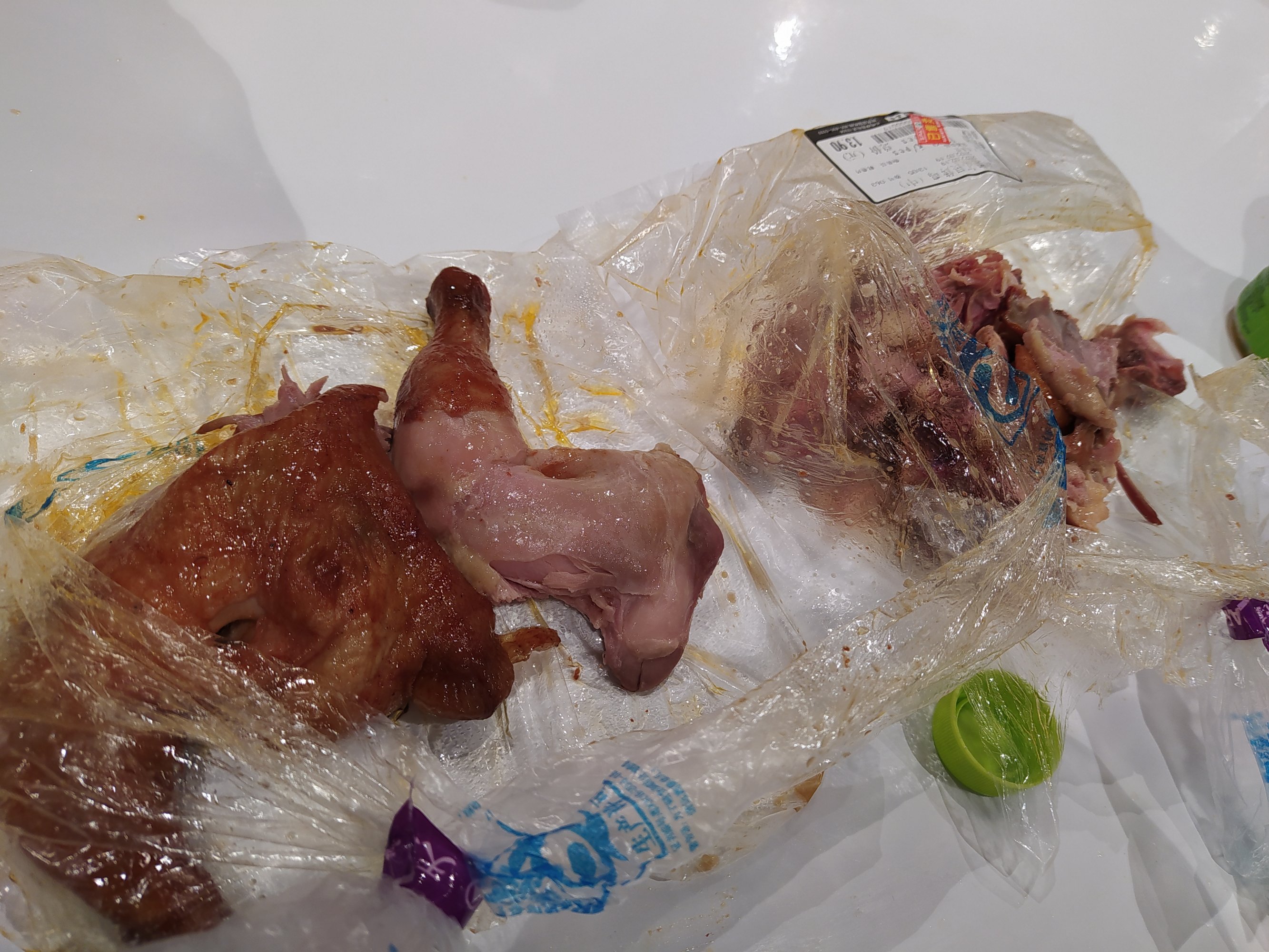 那个手撕鸡是用那种透明的一次性饭盒装的,吃的时候才发现变味,闻起来才发现臭的