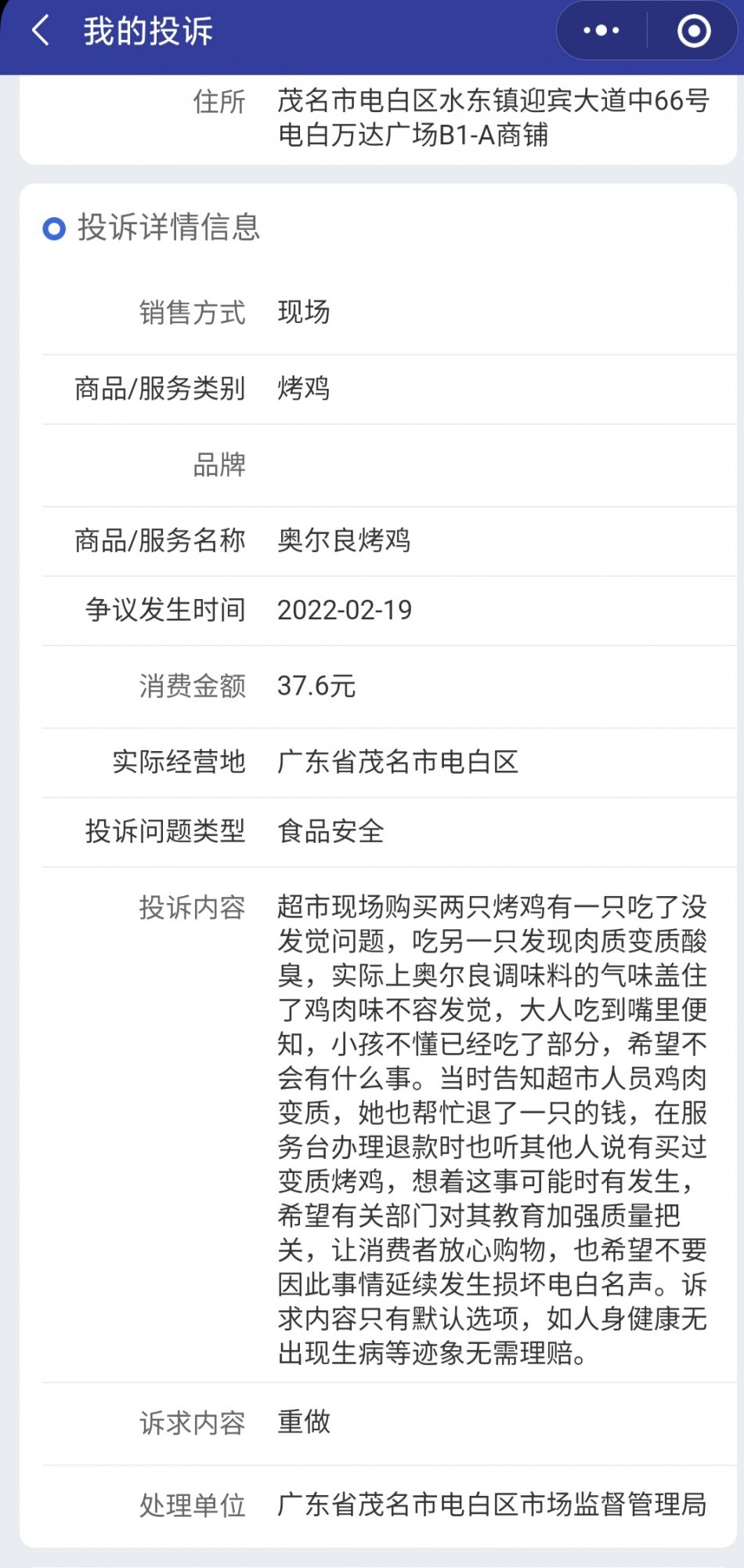 看到你发帖投诉万达嘉荣超市买到变质鸡肉我再次感到很失望,看来上次投诉根本就没起到作用,变质商品一直还在卖。