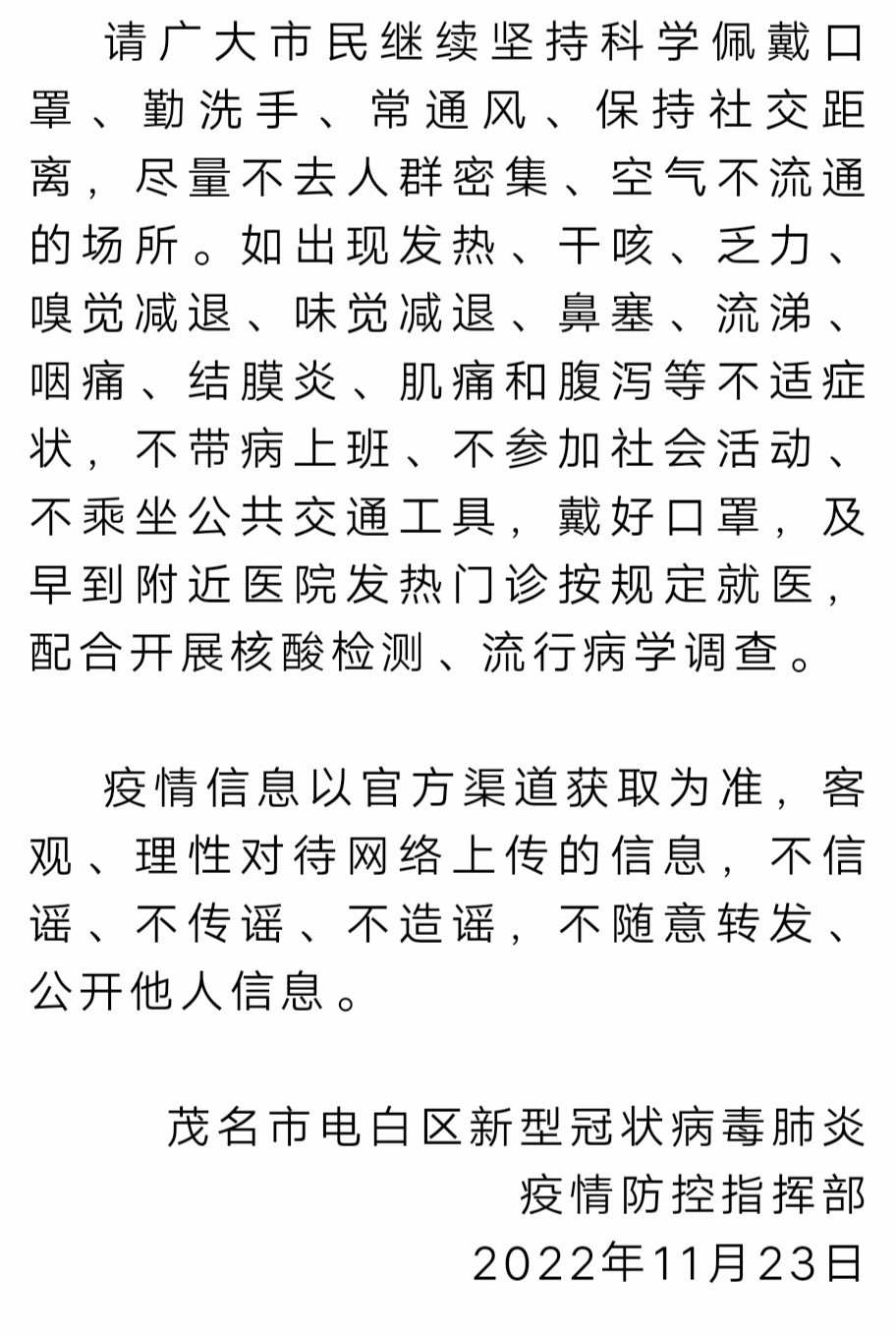 及早预警,及早预示,及早摸排,及早发现,及早处置...,盼望大家能配合与谅解!排除降低社会面,期望能早日清零,最好零增长?或增长与风险降至最低,优化二十条,尽可能用心用情减少对民生、经济等等领域的波动...电白是福地!说得虽然有点打鸡血,好像有些年了,但还是说声电白加油!
