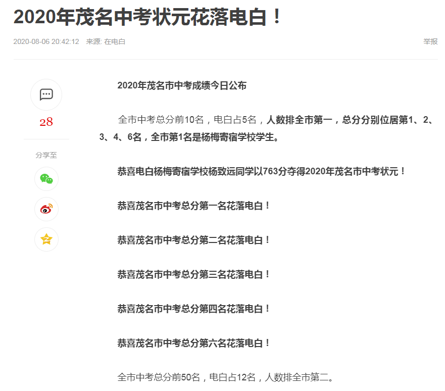 三年前的中考状元杨同学是我们梁局亲自家访,做了大量思想工作才留下电一中就读的,不知到高考成绩如何?有知道的818! 听闻今年茂名高考很好,全省100名内有几个,参考中考成绩,我们大电白应是丰收年。如果这届高考都不如人,以后就不能把责任再推给初中学校没生源了。