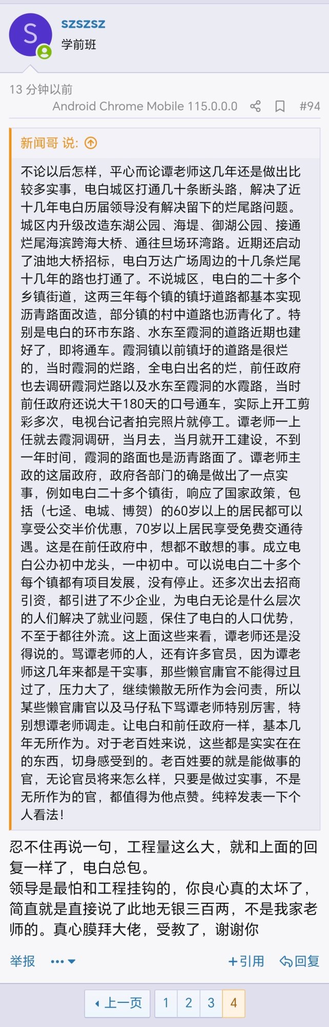 不论以后怎样,平心而论谭老师这几年还是做出比较多实事,电白城区打通几十条断头路,解决了近十几年电白历届领导没有解决留下的烂尾路问题。城区内升级改造东湖公园、海堤、御湖公园、接通烂尾海滨跨海大桥、通往旦场环湾路。近期还启动了油地大桥招标,电白万达广场周边的十几条烂尾十几年的路也打通了。不说城区,电白的二十多个乡镇街道,这两三年每个镇的镇圩道路都基本实现沥青路面改造,部分镇的村中道路也沥青化了。特别是电白的环市东路、水东至霞洞的道路近期也建好了,即将通车。霞洞镇以前镇圩的道路是很烂的,当时霞洞的烂路,全电白出名的烂,前任政府也去调研霞洞烂路以及水东至霞洞的水霞路,当时前任政府还说大干180天的口号通车,实际上开工剪彩多次,电视台记者拍完照片就停工。谭老师一上任就去霞洞调研,当月去,当月就开工建设,不到一年时间,霞洞的路面也是沥青路面了。谭老师主政的这届政府,政府各部门的确是做出了一点实事,例如电白二十多个镇街,响应了国家政策,包括(七迳、电城、博贺)的60岁以上的居民都可以享受公交半价优惠,70岁以上居民享受免费交通待遇。这是在前任政府中,想都不敢想的事。成立电白公办初中龙头,一中初中。可以说电白二十多个每个镇都有项目发展,没有停止。还多次出去招商引资,都引进了不少企业,为电白无论是什么层次的人们解决了就业问题,保住了电白的人口优势,不至于都往外流。这上面这些来看,谭老师还是没得说的。骂谭老师的人,还有许多官员,因为谭老师这几年来都是干实事,那些懒官庸官不能得过且过了,压力大了,继续懒散无所作为会问责,所以某些懒官庸官以及马仔私下骂谭老师特别厉害,特别想谭老师调走。让电白和前任政府一样,基本几年无所作为。对于老百姓来说,这些都是实实在在的东西,切身感受到的。老百姓要的就是能做事的官,无论官员将来怎么样,只要是做过实事,不是无所作为的官,都值得为他点赞。纯粹发表一下个人看法!