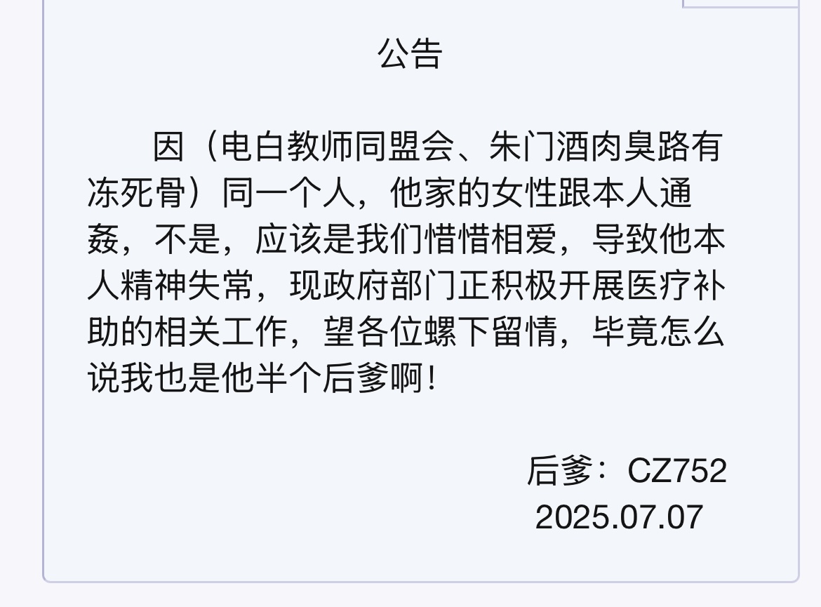 讣告 CZ752因乱伦他奶奶,又乱伦他母亲,他爷爷乱伦他母亲和他老婆,他爸也乱伦他奶奶和他老婆,此禽兽一家人作恶多端,昨天刚被狗咬掉了蛋蛋,变成太监,今天又被雷公劈死。从此一家共赴黄泉,永世不得超生。 特此公告