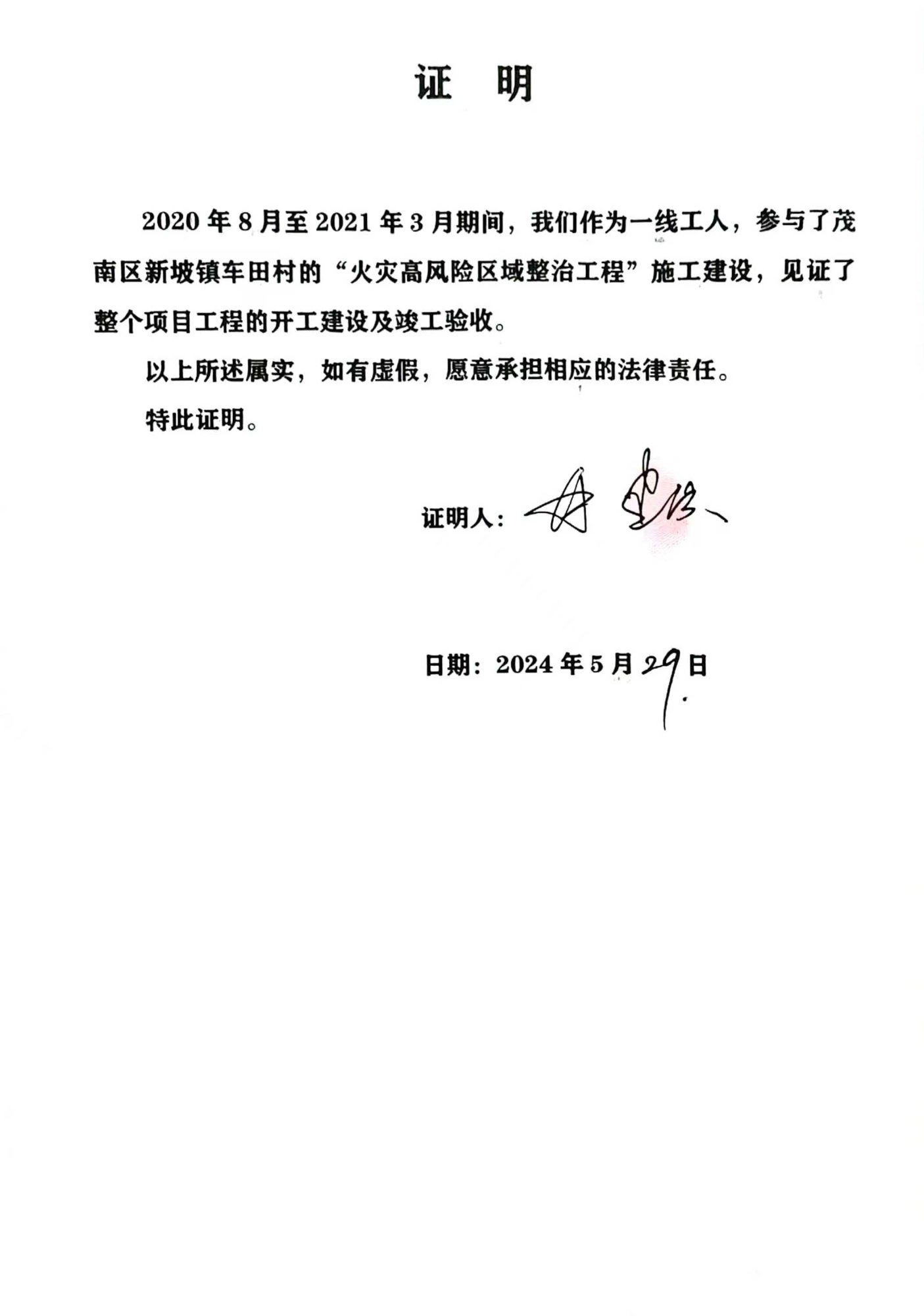 对于此次火灾高风险区域整治工程,车田村委会出具的书面证明,证实了该工程由茂名市众扬设计制作有限公司陈先生等人施工建设。工程竣工不久后,杨敏镇委书记完全否认此事,他说按合同办事,言下之意当时双方没签合同,且事后也不补签,巳至于郑勇患病因无钱医治而去逝。30万元的工程款就等于打水漂了,十位工人耗时8个月的汗水就是白流了,岂不是挖一个巨大的火坑让群众往里面跳吗?