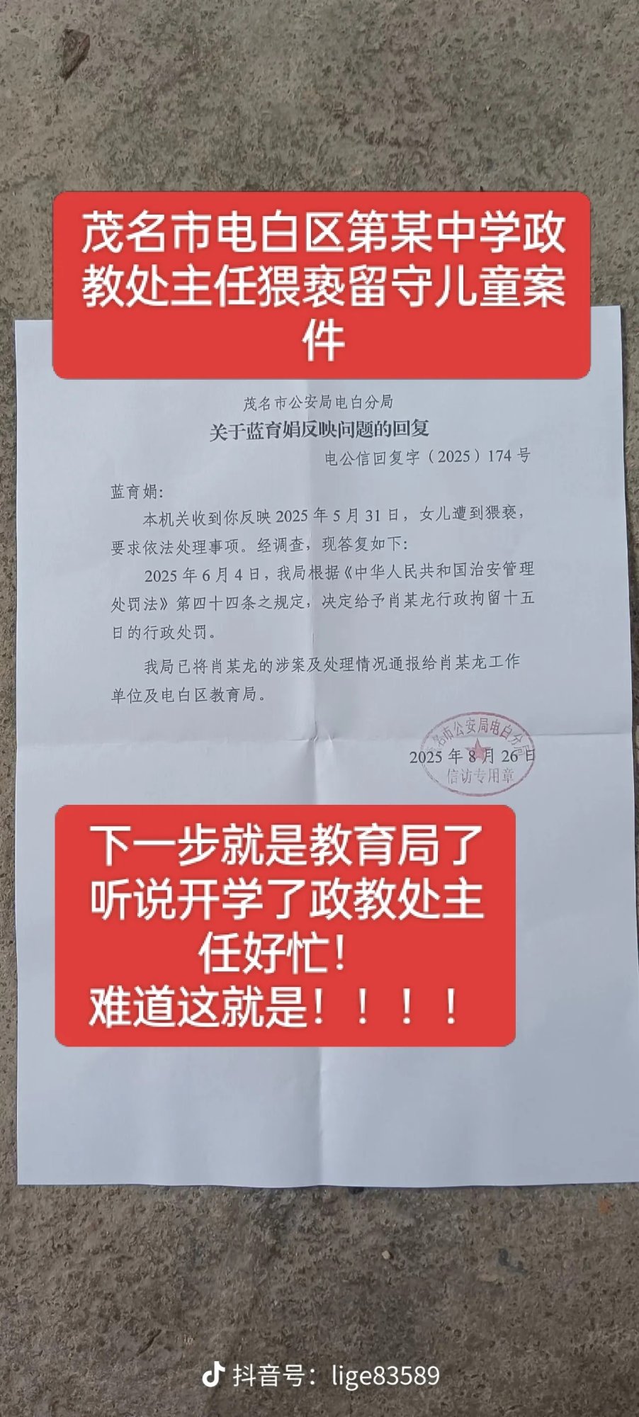 电白二中肖增龙,这种禽兽就不必要用某某了,害人一生,女孩以后在村里再抬不起头了。