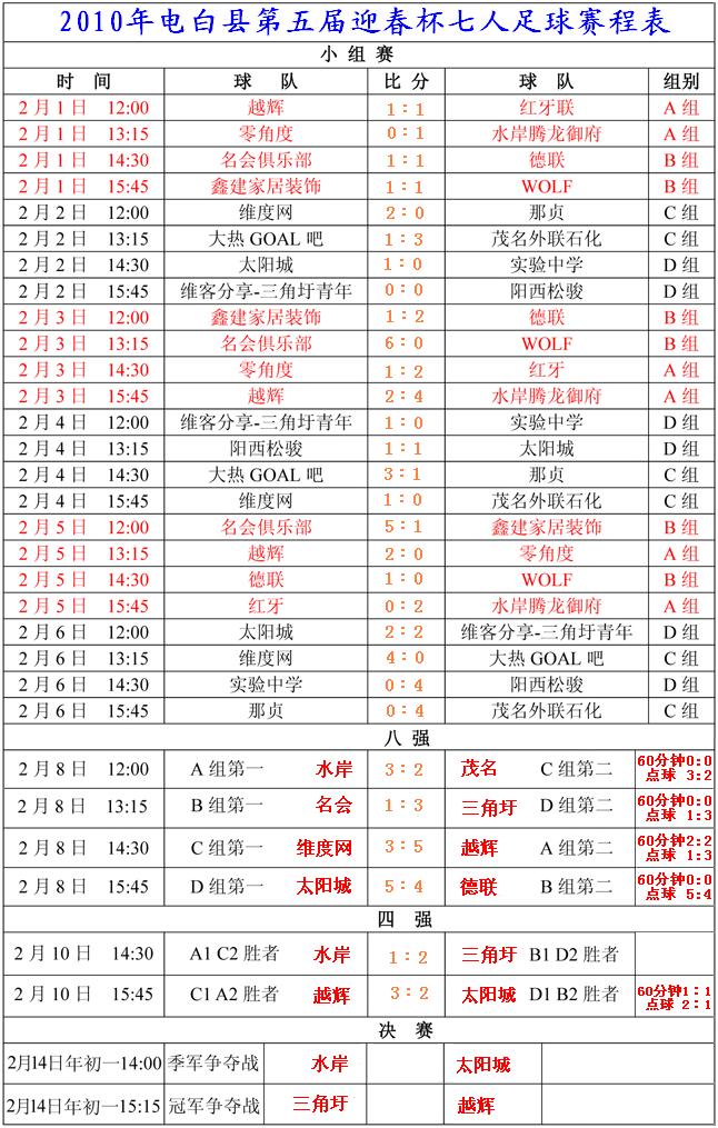 路虎 初中三年级 注册 2009-06-03 帖子 523 反馈评分 0 点数 0 2010-02-16 #63 2010年第五届迎春杯七人足球赛全部赛果 部分赛果来源只是道听途说,未经组委会证实,如有记录错误,敬请见谅! [attachmentid=232116] 附件 2010第五届“电白人”迎春杯足球赛-赛程表.PNG 278.2 KB · 查看: 511