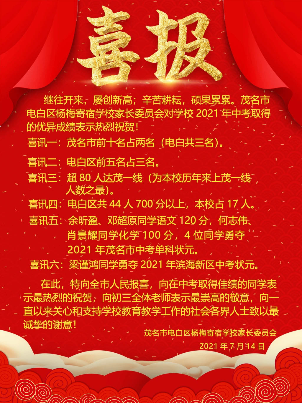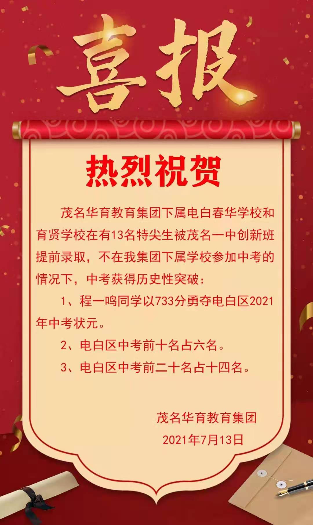 今年电白中考状元在春华,其他学校中考成绩如何,上线率多少?