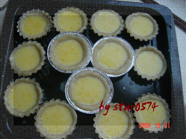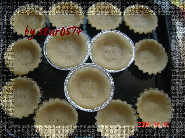 2.把面粉过筛,加入(1),拌匀。然后将制成的蛋塔水过滤,倒入塔皮中