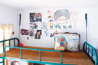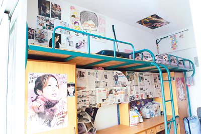 宿舍 笔笔床上的墙壁上贴满明星画像,以及绘有她漫画头像的海报。