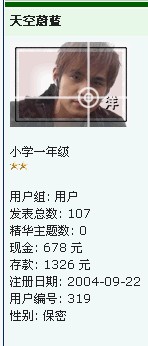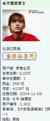 非你不娶 本人出租,有意者Q我 荣誉会员 注册 2004-08-26 帖子 17,850 反馈评分 0 点数 61 年龄 37 2005-09-26 #68 那些前一百名编号的大部分给浪费了 偶是珍稀动物哈