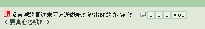 在东城版潜水我喜欢的主题帖是 1.f出的真心!!! 2.怪异造句,考你的智商 !!! 目前页数分别达到86与51在此版超火爆!!! 还有一个词语接龙 觉得也不错!! 以前水中版也玩过现在都沉到底了!! 懒得再去顶上来!!所以在这偷师转去!!嘿嘿!!! 大家有空去水中溜达溜达!!多谢!!!