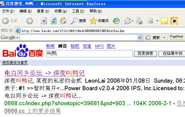 潘火鸡 小学三年级 注册 2005-07-08 消息 247 反馈评分 13 点数 1 2006-03-14 #1 在百度搜索“叫鸭”,第一页第一条结果竟然是。。。。 [attachmentid=71303] [attachmentid=71305] 附件 111111.jpg 78.9 KB · 查看: 296 222222.jpg 182.6 KB · 查看: 308