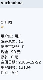 QUOTE(狼啸月 @ 2006年05月09日 Tuesday, 02:41 PM) xuchaohua的性别说明是女的,用“断背山”来形容是否得体?探讨中…… [snapback]1195960[/snapback] 细节没注意到,差点误了段美好姻缘,罪过罪过!