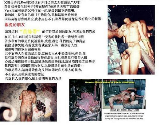 据我了解,华裔自1995年起,一直是印尼的主要投资者。但在印尼他们连三等公民都不是,我听说在棉兰有很多华人子女被绑架,女性被强暴。有一间华人经营的时装店被抢劫后,店主11岁的女儿更被强奸,然后施暴者还以木棍插入女童下体,女童最终不治身亡。后来我开车去过华人的聚居区和商业中心,无一例外,整条街整条街的被洗劫一空,到处是断壁残垣。就是中国人记忆中的"三光政策"--"烧光、杀光、抢光"。我在参观的过程中真正体会到自己做为日本人是多么的幸运,因为这是活生生的暴力事件,而不是电影 剧本,哪些以前在影视镜头中看到的砍刀砍头的镜头就活生生的发生在我住的城市,非常 震撼人的心灵,至今我都不能忘记。