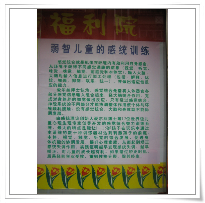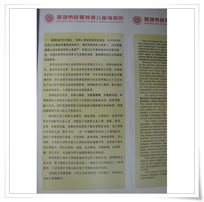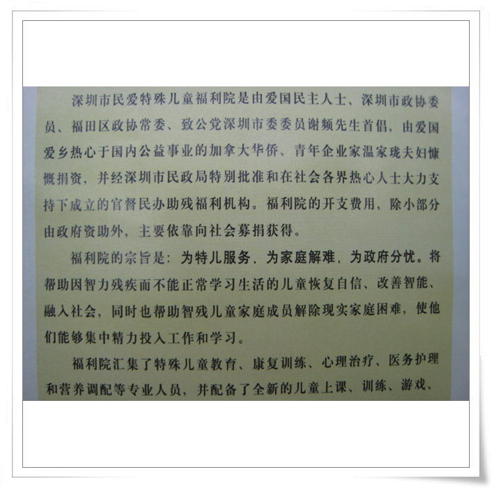 经深圳市残疾人联合会介绍,昨天下午去深圳梅林慰问和看望一家特殊的、民办的社会福利机构---民爱特殊幼儿园,入园的都是脑瘫的儿童,在该民办的特爱福利院宣传册上,赫然看到温家珑的名字。