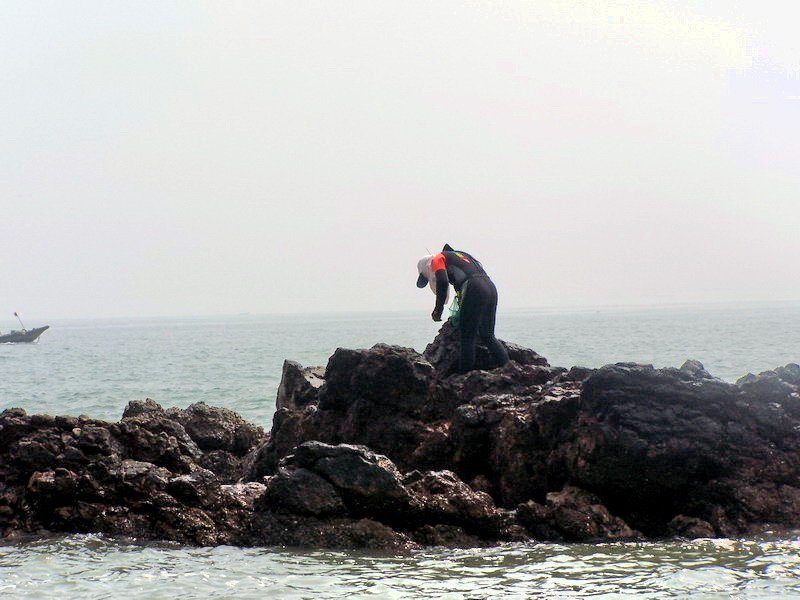 大家若在海边的石头上玩,千万要注意那些贝壳类物质,光着脚很容易被割到的,我就中招了,后来穿鞋了,又滑一次,在拍的时候,没留意,居然被一个浪盖了半身,幸好相机没事!