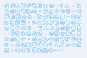^xu..♂ 幸运儿 注册 2006-11-23 消息 1,928 反馈评分 0 点数 0 2007-02-22 #52 QUOTE(N @ ,,2007年02月08日 Thursday, 09:00 PM) 从现在开始我只打你一个人,欺负你还会骗你,答应你的每一件事都懒得做, 对你讲的每一句话都是谎话,就喜欢欺负你骂你更不会相信你,有人欺负你我会第一 时间出来踩你,你开心就要弄得你伤心,你不开心我会超级开心,永远都觉得每个人都 比你帅,做梦也要鄙视你.... [snapback]1658890[/snapback] 不要这样欺负我好吗....?