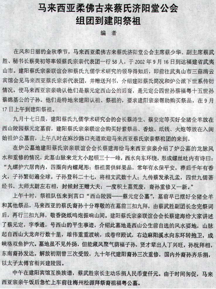 四中乐叔 版主 版主 注册 2006-05-06 消息 6,725 反馈评分 3 点数 61 2007-03-15 #63 马来西亚柔佛古来蔡氏济阳堂公会组团到建阳祭祖 附件 ts3.jpg 153.1 KB · 查看: 1,048