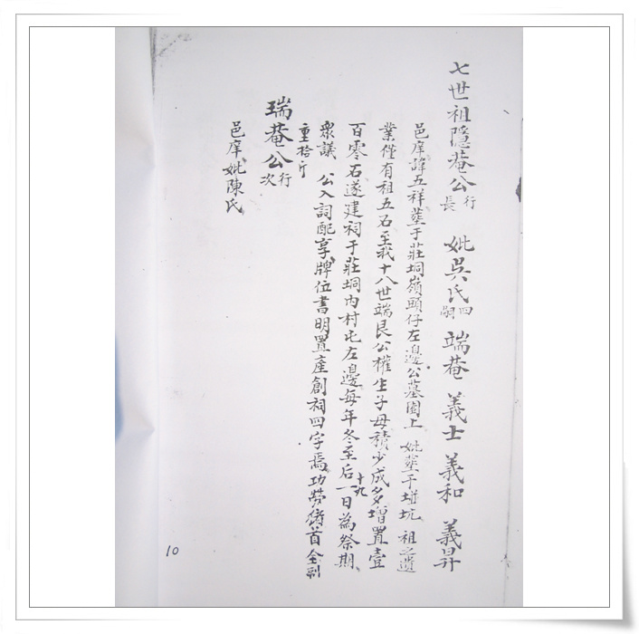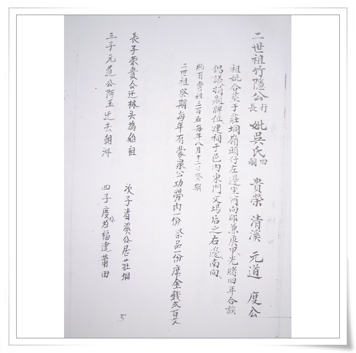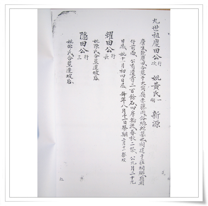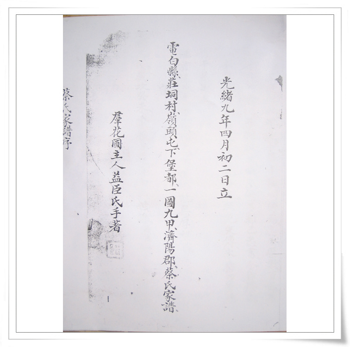 四中乐叔 版主 版主 注册 2006-05-06 消息 6,725 反馈评分 3 点数 61 2007-04-15 #74 QUOTE(四中乐叔 @ 2007年02月28日 Wednesday, 12:04 AM) 广东省电白县 蔡氏家谱 族谱 蔡族历代祖妣名序列下 始祖秋涧公妣邵氏太恭人生二子 长子度公回莆田 次子竹隐公居P垌(广东省电白县电城镇P垌乡) 祖曾任州太守,福建省兴化府莆田县珠玑巷人。离任归里路过P垌时,见此地风土人情甚佳,举家自宋末帝m(约公元一二七八年)时,由原籍迁居P垌,即电城东十里之P垌乡,并带祖父济阳公塑像,将之供祀于村边新建济阳公祠,今境主庙前戏台后,而起旧址也,俗称“妆春宫”以后代虔诚之心,后代子孙繁衍,人口增多便成为蔡屋村。清道光年间,秋涧子孙定阴历元月十五日为济阳公祭祀日,每隔一年元月十四、十五、十六日为“年例期”,搭演戏,举行“妆春”扮演话剧等民间活动,俗称扮“佛地”以表鞭鞑,迎接福祥。 来时带有压船石版一块、石臼一只,现有存在。石版在庙前、石臼在山觅太夫人庙边。回想自宋至今数百年之久,传有卅余代,其后裔之盛,族旺之隆,冠于全邑,非祖德之远庇,安能若是乎,天之功报厚德者,理有或爽哉。 祖享寿七十九岁,于元十八年二月十七忌日。 妣享寿七十二岁,于元十二年三月十六忌日。 大宗祠建P垌内村屯,坐西向东。入伙对联:长发其祥,暖(?)得我所。大宗祠门联:济阳欣庆,f垌分基。蔡族济阳郡。 祖妣合葬白花岭大垌村后坐甲向寅。 二世祖竹隐公妣吴氏太孺人生四子。 长子荣贵公迁林头(电白县林头乡)为始祖,次子居P垌,三子道公迁迁潮州,四子度公回莆田 边地头 [snapback]1684989[/snapback] 附件 IMG_0078.jpg 105.3 KB · 查看: 834 IMG_0079.jpg 159.7 KB · 查看: 838 IMG_0080.jpg 123.1 KB · 查看: 881 IMG_0081.jpg 160.4 KB · 查看: 927 IMG_0082.jpg 116.6 KB · 查看: 913 IMG_0083.jpg 121.2 KB · 查看: 924 IMG_0084.jpg 108.9 KB · 查看: 820 IMG_0085.jpg 125.8 KB · 查看: 874 IMG_0086.jpg 118.2 KB · 查看: 849 IMG_0087.jpg 121.4 KB · 查看: 842 IMG_0088.jpg 108.4 KB · 查看: 828 IMG_0089.jpg 118.7 KB · 查看: 877 IMG_0090.jpg 121 KB · 查看: 943 IMG_0091.jpg 109.2 KB · 查看: 849 IMG_0092.jpg 103.6 KB · 查看: 855 IMG_0093.jpg 93.8 KB · 查看: 839 IMG_0094.jpg 88.6 KB · 查看: 815 IMG_0095.jpg 94 KB · 查看: 737 IMG_0096.jpg 124.4 KB · 查看: 834 IMG_0097.jpg 110 KB · 查看: 777