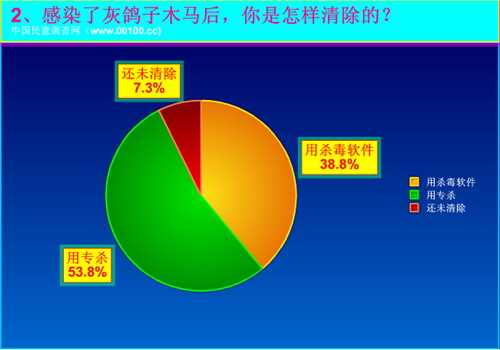 据金山毒霸全球反病毒监测中心数据显示,仅2007年2月,中国约有258235台计算机感染灰鸽子,而同期国内感染病毒的计算机总共才2065873台,也就是说中国每10台感染病毒的计算机中,就有超过一台感染了灰鸽子。