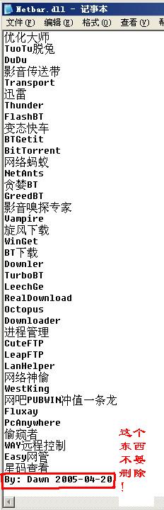 送你一份礼物吧. 禁止非法程序运行 它可以禁止一些对网吧不利的软件运行. 比如 网络执法官 灰鸽子 在线破解 winhex 广外女生 传奇杀手 传奇终结者 huangjiaju.exe pj.exe 还原精灵密码读取器 还原幽灵 还原精灵清除器 在线清除 密码读取器 幽灵 进程杀手 IceSword 柳叶擦眼 Kill process 系统查看大师 进程清除 还原精灵密码读取 添加到收藏夹 超级兔子 魔法兔子 优化大师 影音嗅探专家 进程管理 CuteFTP LeapFTP LanHelper 网络神偷 WestKing 网吧PUBWIN冲值一条龙 Fluxay PcAnywhere 偷窥者 WAY远程控制 Easy网管 星码查看 等,.....希望你不要禁止:迅雷.如果你不想被下载软件拖慢网络.,建议使用P2P终结者来限制速度好了.个人建议限制为100KB/S左右. 介绍一下,解压包里有2个程序一个是Netbar.dll一个是delrun.exe Netbar.dll可以用文本文档来打开. 然后望里面添加需要限制的程序. 只要一运行被禁止的程序就会自动关闭(包括网站的字符,绿色软件) 为了保证程序能安全启动,启动delrun.exe程序后或者系统重起后自动运行 delrun.exe程序后30以后产生启动过滤的主程序System并运行,40秒后检测 过滤程序是否运行,未检测到的话会再次产生文件并运行!检测到以后在检 测后10秒后关闭主程序减少内存占用! 另:delrun.exe运行后自动创建随系统启动而启动!并在30秒后启动主程序! 然后关闭自身启动程序! 建议把这两个解压包放在C:\WINDOWS\system文件里 因为它在进程里面显示的是system值 解压包的密码就是你的手机号码...