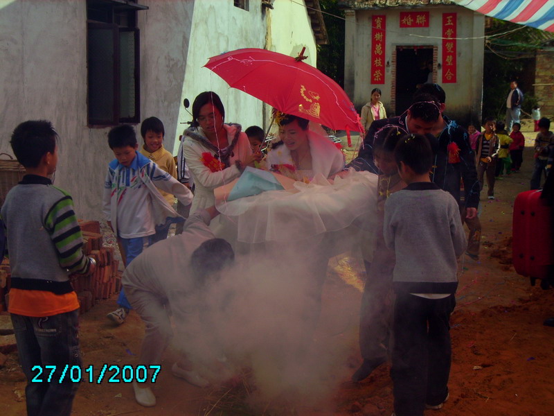 新娘不论出门或进门,都得从火堆上跨过。算是电白婚俗的一大特色,不知别的地方是不是也要这样。