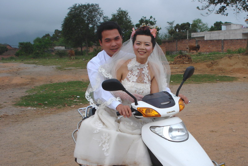 小车迎亲见多了,摩托车见过不?看新娘子还是蛮开心的,呵呵。