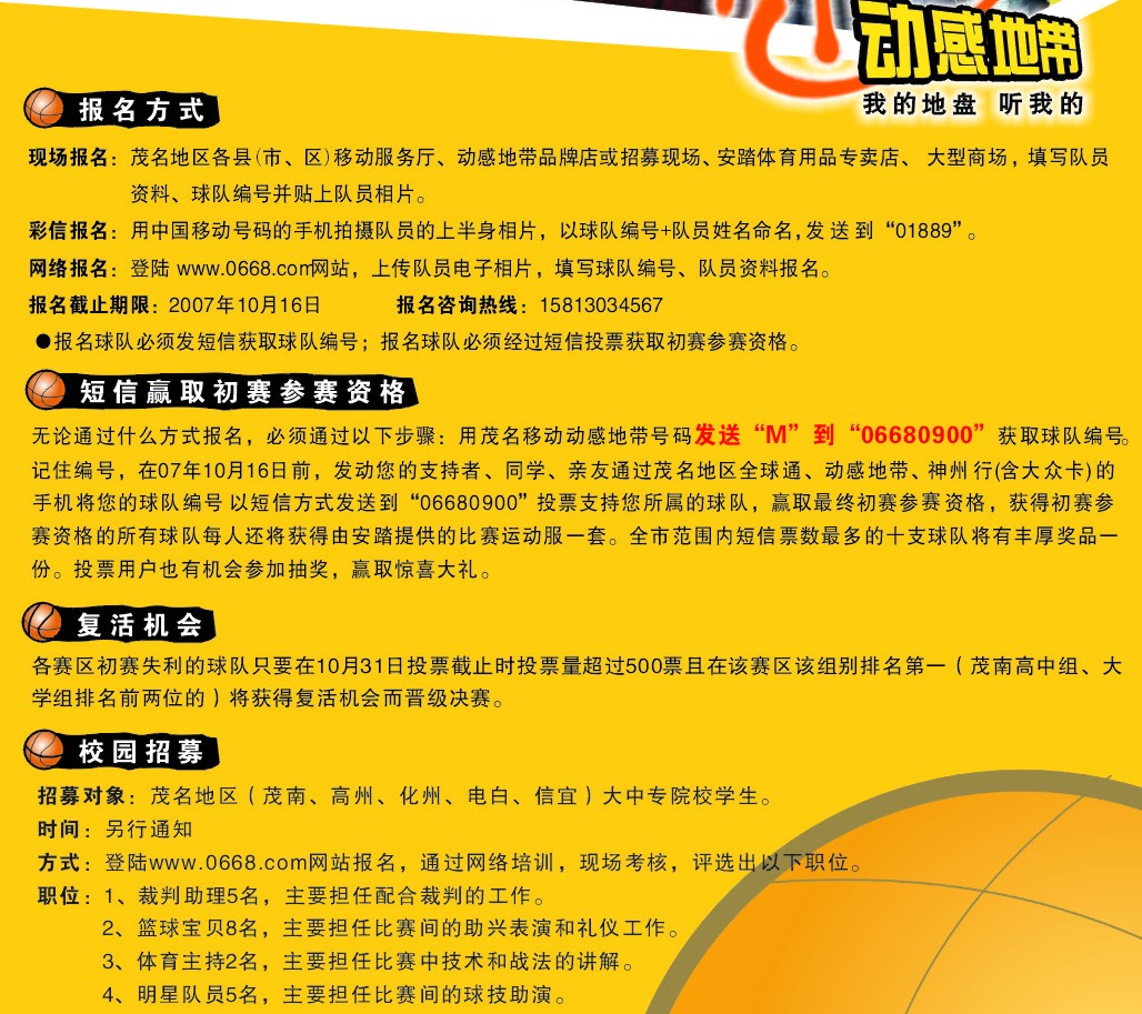 L lin_jump 幼儿园 注册 2007-06-12 消息 26 反馈评分 0 点数 0 2007-10-09 #1 电白动感地带三人篮球赛即将拉开序幕! 奖金高达1500元,还有安踏公司提供的价值588元的运动大礼包!快快来参加啦! 详情请咨询当地移动服务厅;或加入QQ群:48305540 附件 篮球1.jpg 132 KB · 查看: 362 篮球2.jpg 296.8 KB · 查看: 350 篮球3.jpg 129.7 KB · 查看: 340