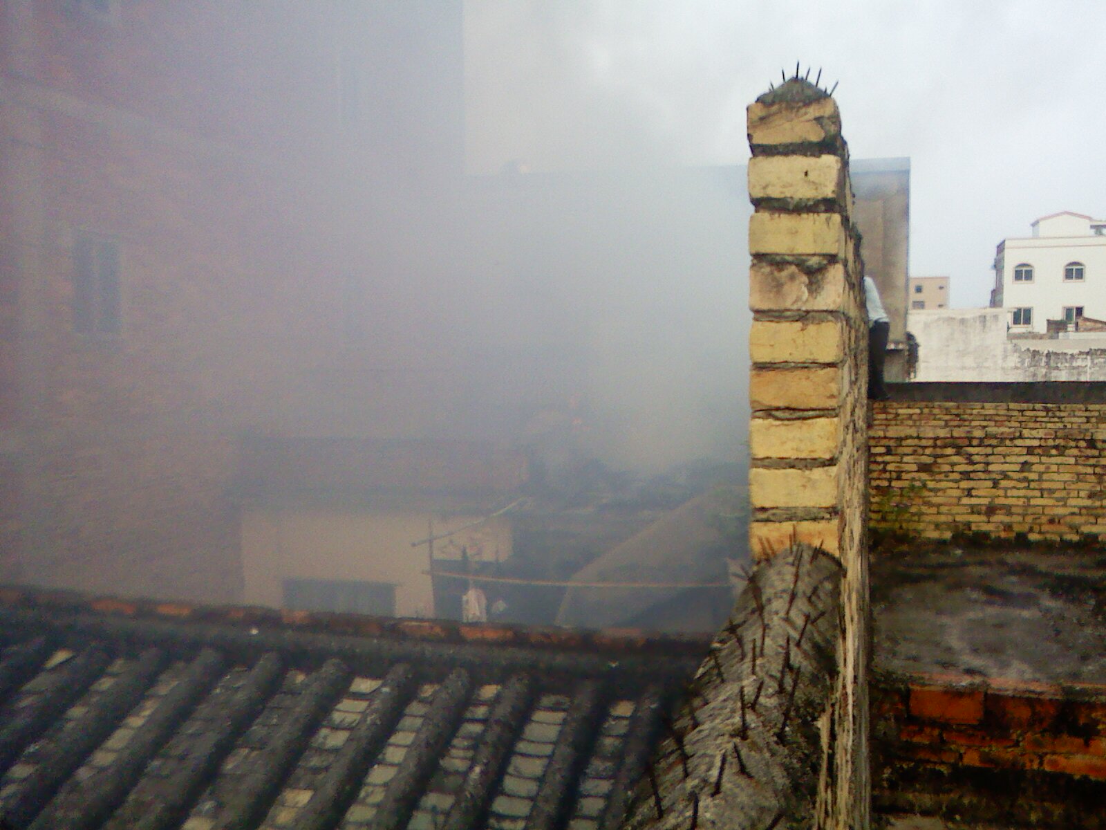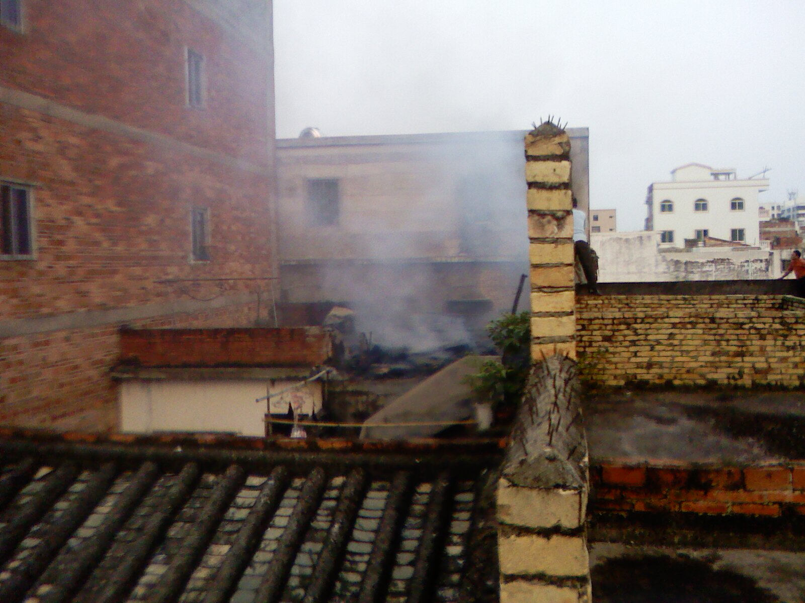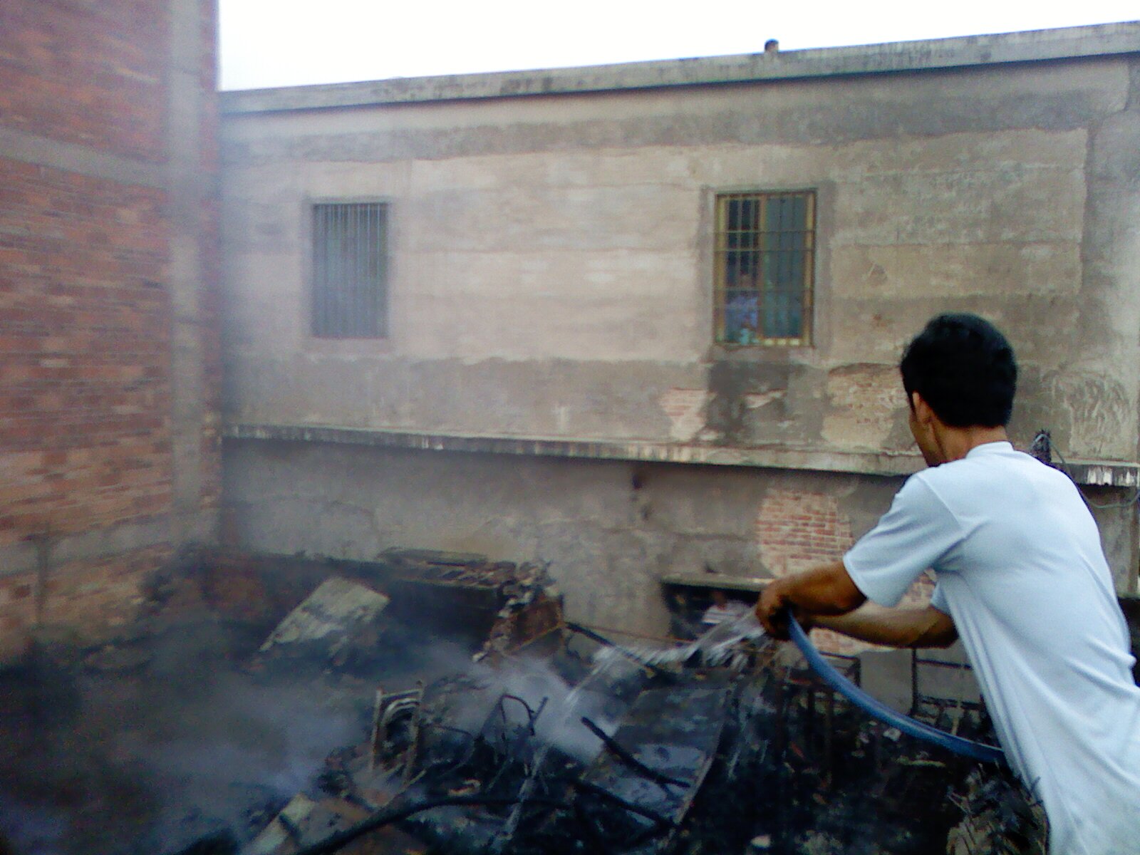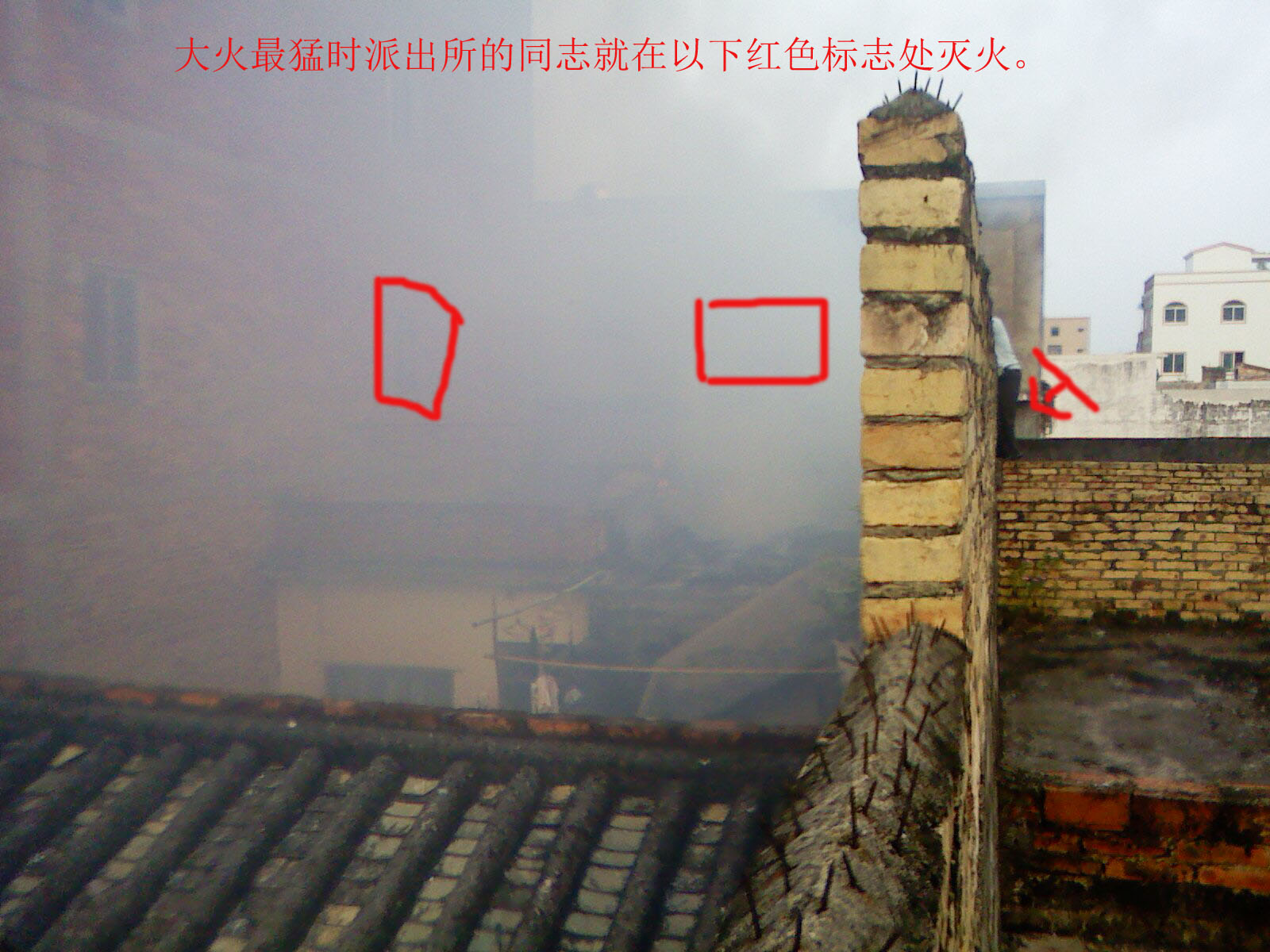 本人相机对面烧得最猛位置旁的窗口及左侧窗口,以及我持相机这边都在派出所同志,你以为在玩,当时火中是有煤气瓶的,大家只能在安全第一的情况下灭火