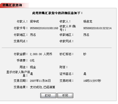 2007年11月6日16点20分,同城网转2000元(手续费0)到杨启生的弟弟杨启龙的工行账户做生活费。