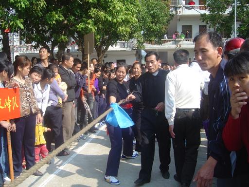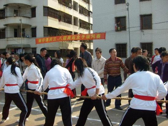 3月7日,树仔镇政府篮球场、树仔镇村委会篮球场上喊声震天,加油声、欢呼声此起彼伏,由树仔镇妇联举办的“庆三八,迎奥运”拔河比赛正在这里紧张进行。整个赛场上人头攒动,各个参赛队的拉拉队高举着彩旗,手舞足蹈为队员摇旗呐喊,赛场气氛异常热烈。原来这里正在举办树仔镇“庆三八,迎奥运”女子拔河比赛。