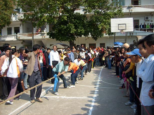 在比赛现场,各队队员们为了争夺奖牌,纷纷铆足劲,咬紧牙关。来自各单位的啦啦队员们比赛场上的队员还要紧张,满场把脚把住、千万别松手等加油声不断。随着裁判员的一声令下,比赛正式开始,参赛双方的女同胞们都使出九牛二虎之力,劲往一处使,其中最精彩的一场要数旦海代表队与江山代表队的比赛。别以为这些女同胞平时斯斯文文,比赛起来可是有板有眼,一点也不亚于训练有素的专业队。双方队员势均力敌,精彩的角逐博得现场观众的阵阵掌声和喝彩声,最终旦海代表队战胜江山代表队,将拔河比赛的现场气氛推向有一个高潮。
