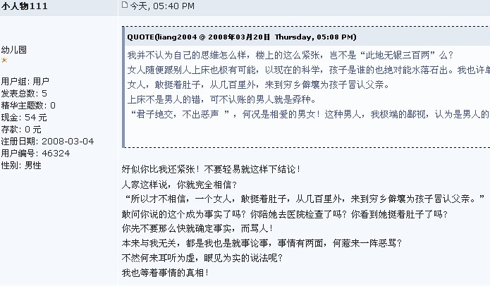 借问声:你如此确定这是事实!你有陪她到医院检查过?你有亲眼看到"一个女人,敢挺着肚子,从几百里外,来到穷乡僻壤为孩子冒认父亲。"???