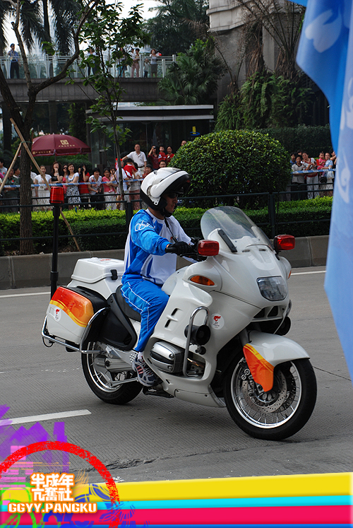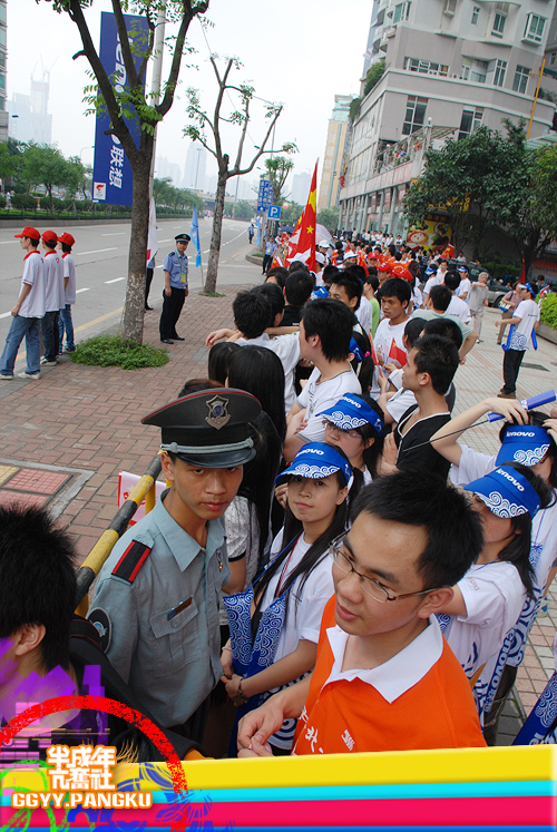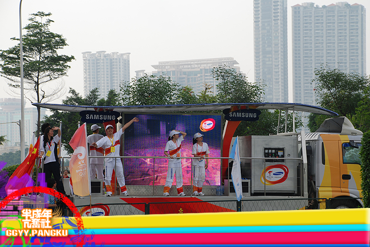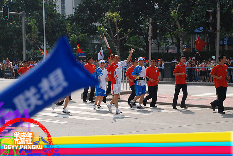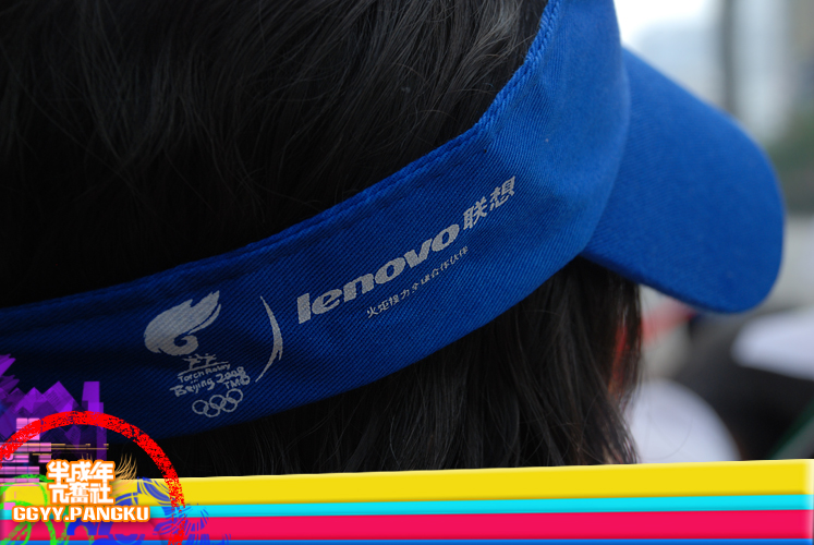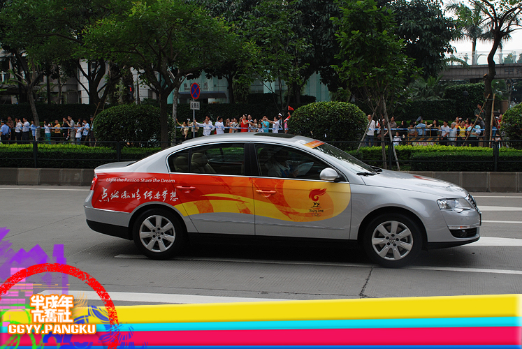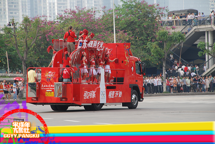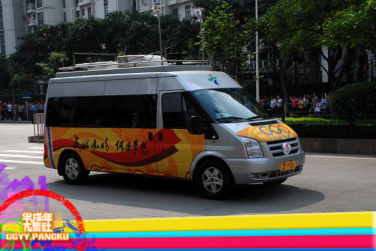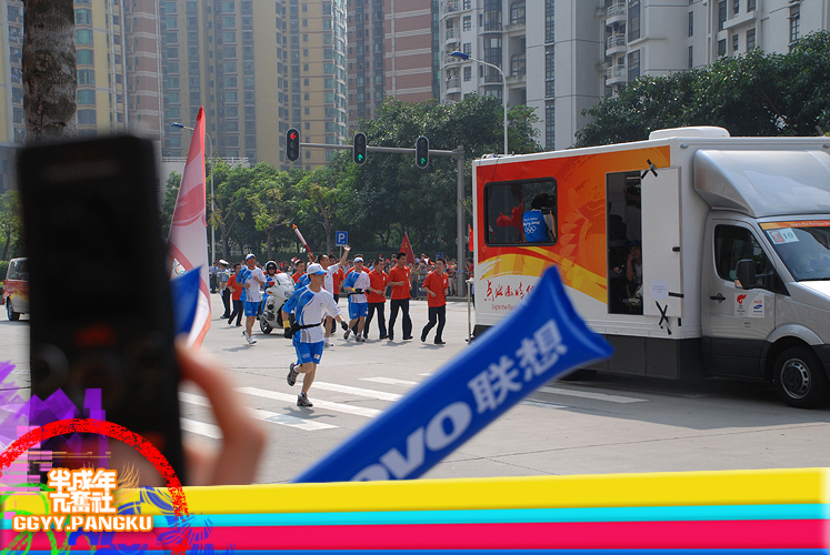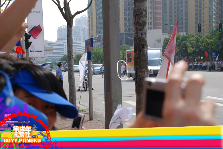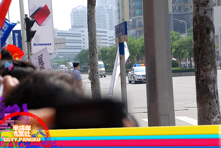 就短短的几秒..圣火就这样走过了.. 后面跟着的后勤车慢慢驶来.. 看过<新闻日日睇>的人因该很熟悉坐在车里的光头佬.. 后面还有圣火赞助商的花车.. 有可口可乐.联想.三星.. 天上的直升灰机灰来灰去好多次了.. 那位大叔真叼..哈