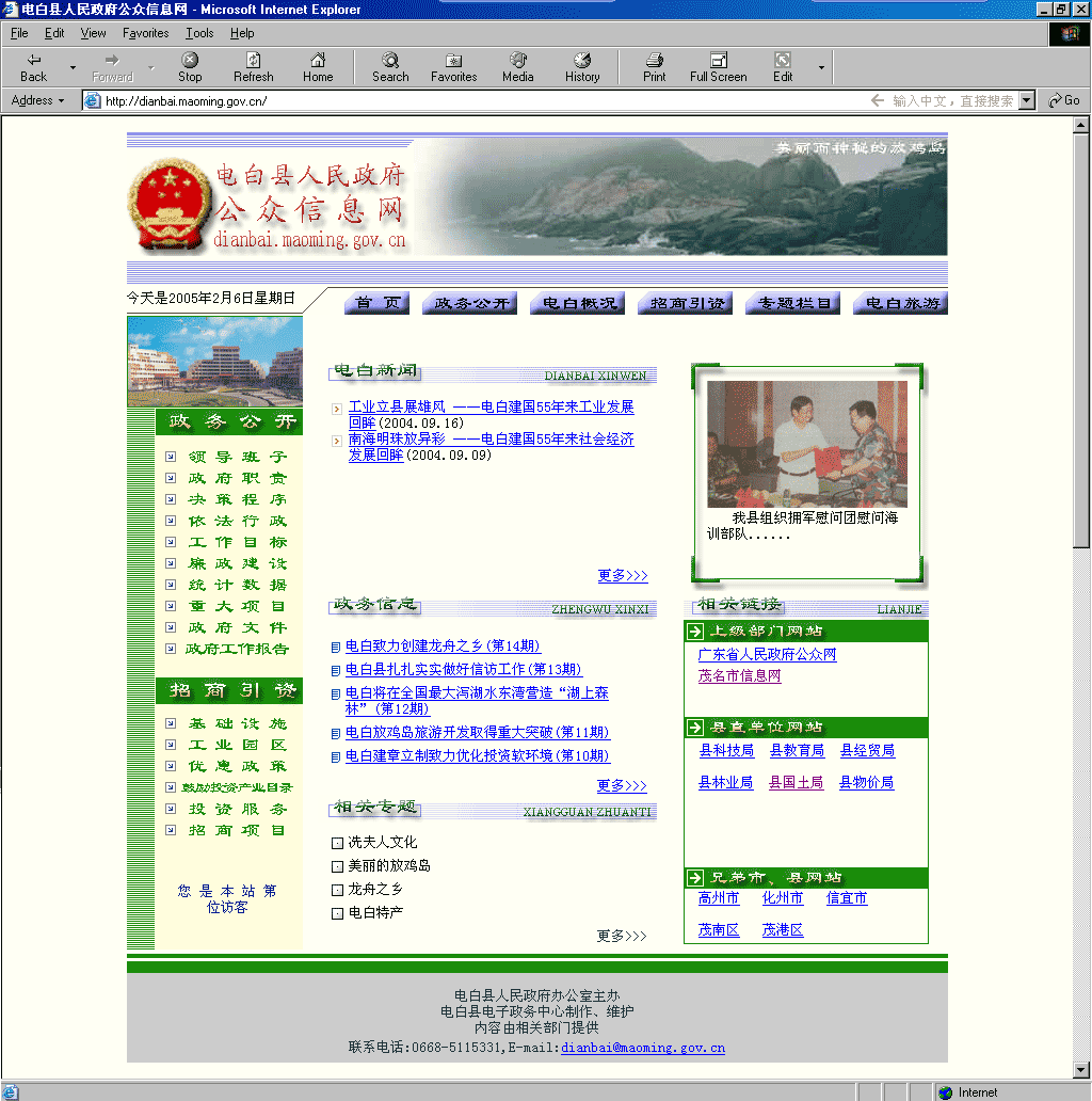 [attachmentid=9654] 上图为《电白县人民政府公众信息网》,一个政府的网站代表一个地区的形象,是向外宣传地区形象的窗口。从上图来看,并不能代表电白县的形象,设计水平有待提高,而且内容缺少实用性,图片处理技术远远达不到标准。在此希望电白县政府的信息工作人员修改网站的设计,如果没有足够的技术支持,我相信在《电白同乡论坛》中的高手会出手相助的。