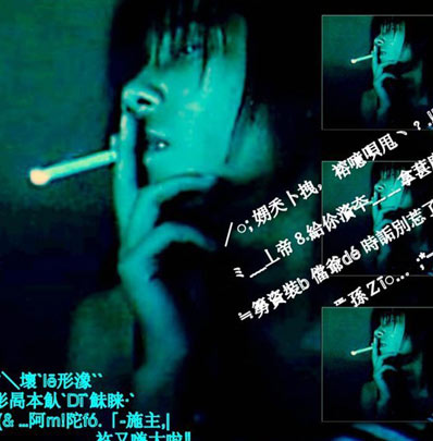 9:以上是装可爱型,一般是非主流女人的最爱,下面是装B型,多半是男人的最爱。她们是这样的:把脸转过去用侧脸来掩盖自己的脸丑,镜头从上面下面左面右 面背面……反正就是不从正面打过来。造成自己一种空虚,寂寞的美,旁边多半还有字,什么“我的寂寞,与你无关”什么“这男子伤透了心“什么“给你的爱其实一直都在,只是你不知道而已”当然肯定是用繁体和符号错综复杂的摆放这些字。