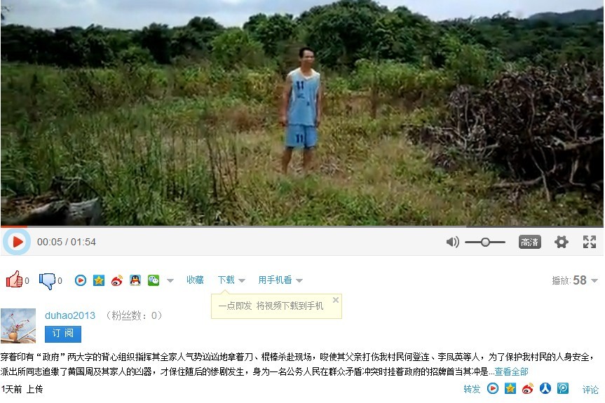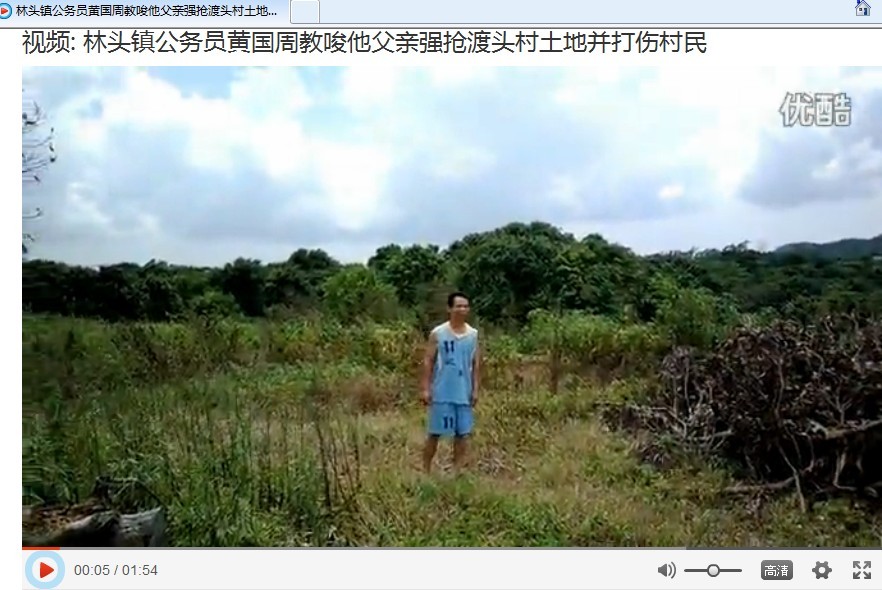第五点:请看程允周发视频内容解说。黄国周指的是穿着蓝色球服的人,能把背心后11号的球服讲成“印有政府”两字的背心。还有提到拿着刀气势汹汹,我怎么只看到图中黄汉光一家几个人空手呢?反而是渡头村人个个人手一把凶器。请注意,这个更经典,此情节在关于各类政府执法新闻上经常用到说法,为保护村民人身“安全”,全村几十人围攻一个70多岁手无寸铁的老头?看到这里,是不是天怒人怨啊?还有提到派出所同志大义凛然追缴黄国周凶器,才保住随后惨剧发生。颠倒黑白能力是否可见一斑?确实,如果当时民警不在,估计黄国周父亲早就挂了。还提到黄国周什么仗权目无国法横蛮举动,通过视频观看,相信大家心理都有一个问号,事实果真如此吗?在有视频证明的情况下都能如此胡言乱编,在其他无视频证明情况下对渡头村的说法更不敢恭维。