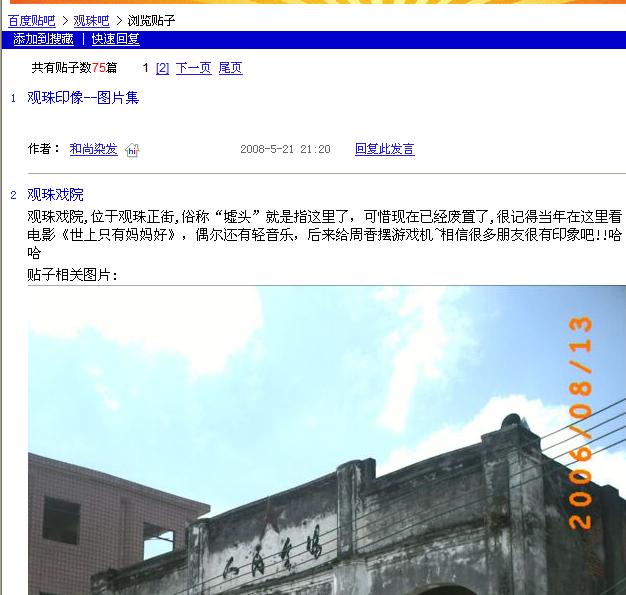 D dodo 初中一年级 注册 2006-04-19 消息 433 反馈评分 0 点数 0 2008-09-25 #7 记得在这个戏院看了一场电影《世上只有妈妈好》》、〈百团大战〉等。戏院倒闭后,周香的游戏室和桌球城成了这里的最大收益者,不过我好像没怎么去玩过,我记得戏院的一扇外墙上有一棵很大的榕树,不知现在还有否?多大了?
