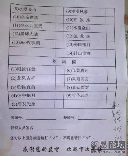 QUOTE(群众 @ 2008年09月30日 Tuesday, 11:32 AM) 十一期间,技师系统全线繁忙,如有需要服务者,请从速报名,如有问题,请直接联系: 总经理助理:命运 行政办公室主任:byronroy, 美容沙龙经理:づoの~ 桑拿中心经理:大胶吹 健康中心主任:徐长卿 公关部部长:奶茶-王子 他们每人手头上尚有部份新到技师,还在 培训部部长:蛙子 培训中,可以临时使用. [snapback]2464397[/snapback] QUOTE(群众 @ 2008年09月30日 Tuesday, 11:44 AM) 今晚将邀请提前报名的水友,到水区私人会所观摩,请各位提前做好相关准备. [snapback]2464438[/snapback] QUOTE(群众 @ 2008年09月30日 Tuesday, 04:30 PM) 为人民服务,为人民服务. 节目单里尚有以下没有安排,请蒙查查,看清清.详细名单请直接找所长. [snapback]2465296[/snapback] QUOTE(蛙子 @ 2008年09月30日 Tuesday, 08:14 PM) 培训出来了。 国庆期间人手不足,超级富婆将由俺亲自接待 [snapback]2465704[/snapback] QUOTE(群众 @ 2008年09月30日 Tuesday, 11:04 PM) 水区专用车牌号码定于明天开拍,有意者请报名.拍卖官为:总经理助理:命运,此次拍卖的号码将于晚些时候公布. 另:此次暂不进行内衣慈善拍卖,请各位有意捐赠者先自行保管,等玫瑰党集团销售部经理一朵花做好可行性报告再行通知. [snapback]2466052[/snapback] 放大字慢慢看看再说说!