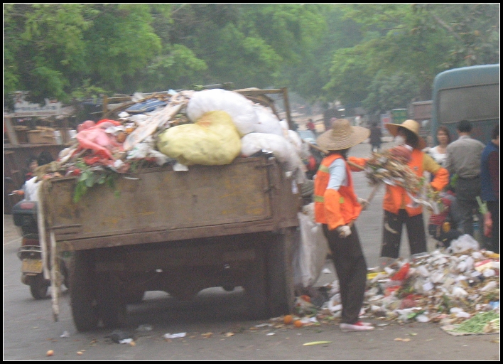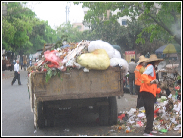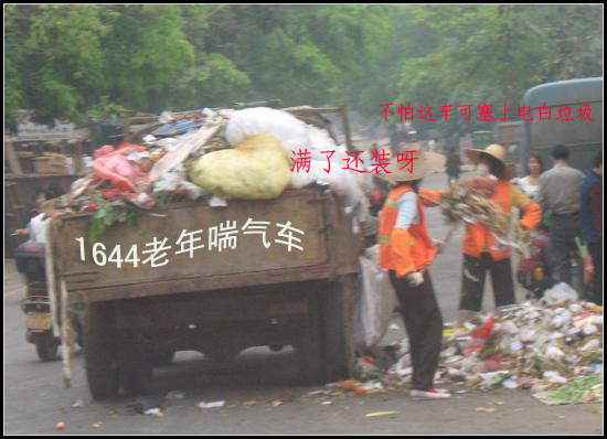 在水东,每天上班、出街,最怕的是跟着垃圾车,破破烂烂,浓烟直冒,臭气熏天,拉圾车一路走,垃圾一路洒落,造成二次污染。车辆、行人纷纷闪避。又兼垃圾车的轮子摇摇晃晃,不知何时脱掉,砸向人群。 那些垃圾车不知是何年何代购买的,如老年喘气,大都没有车牌。行走在街道,险象横生。 有相机的网友不妨拍几张相片看看。