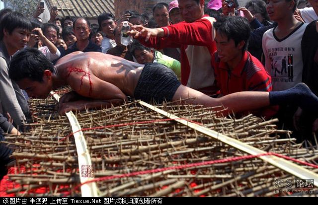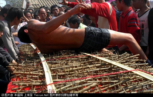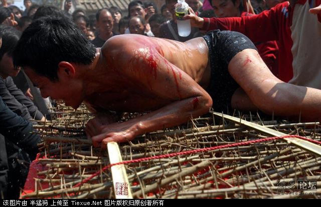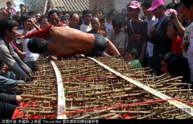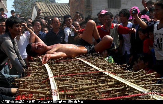 翻刺床就是将葡萄牙刺扎成一张床,勇敢的村民脱光衣服在床上翻滚。翻刺床在这里不叫表演。