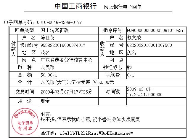 广 广州编辑 学前班 注册 2009-03-03 消息 34 反馈评分 0 点数 0 2009-03-09 #193 QUOTE(广州编辑 @ 2009年03月06日 Friday, 08:43 PM) 我在我们老家的论坛也贴了。也有朋友顶贴了! http://www.521000.com/bbs/dispbbs.asp?boar...6&star=1&page=1 我的小外甥女刚才说她要捐十块钱。待会儿我就帮她转。 看到楼主说小睿坤就要住院了,祝她勇敢坚强,积极乐观接受治疗。但愿众人爱心不仅带给小睿坤帮助,还带给她快乐的性格和积极的态度!给小宝宝加油! [snapback]2711165[/snapback] 附件 汇款10元.JPG 13.9 KB · 查看: 479