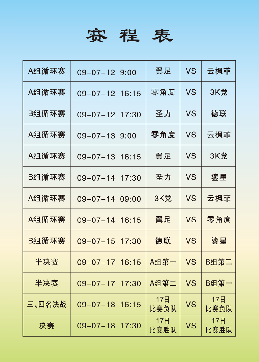 第一场半决赛: 时间:2009年7月16日下午16时 双方比赛队伍: 3K党足球队 对 德联足球队 第二场半决赛: 时间:2009年7月16日下午17时30分 双方比赛队伍: 翼足足球队 对 鎏星足球队
