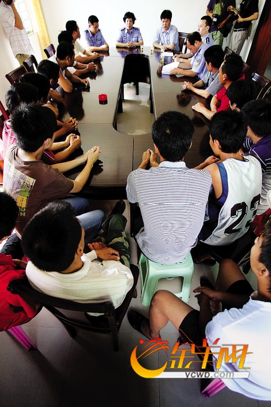 前天,电白县麻岗派出所。20名电话诈骗犯罪嫌疑人投案自首,县公安局长张爱国劝导他们坦白犯案经过 本报记者 何奔 摄