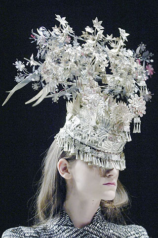 从不向流行谄媚的Alexander McQueen,08年春夏女装继续玩着最擅长的反礼教设计,Alexander McQueen携手帽子设计师Philip Treacy,设计的帽子,头饰以及模特面部装饰物,早已为我们所熟悉,而此次出现,是为了向07年五月去世的英伦风格偶像,帽子女神Isabella Blow致敬,而这两位设计师恰好是Isabella Blow发掘,从而延伸出一段时尚佳话。相比之下更为突出的是一种天马行空的思维与东方文化设计概念的合并。